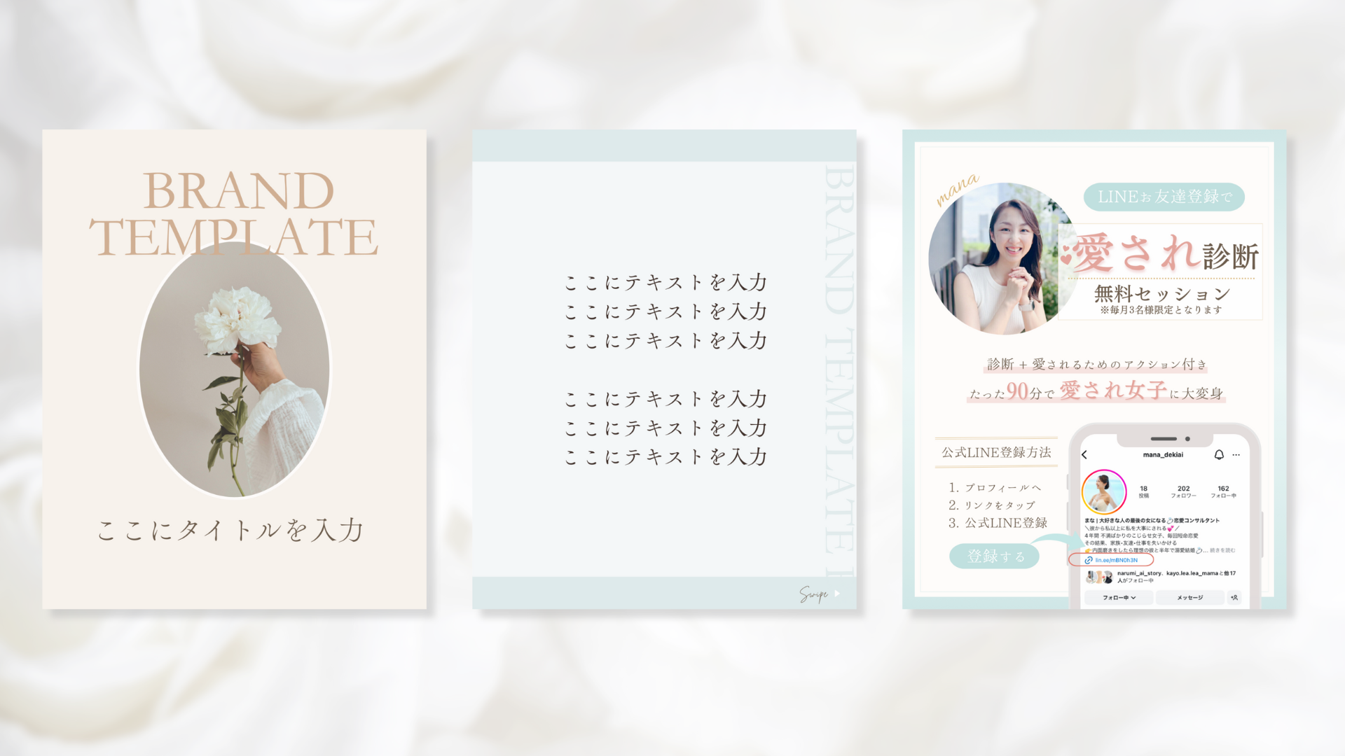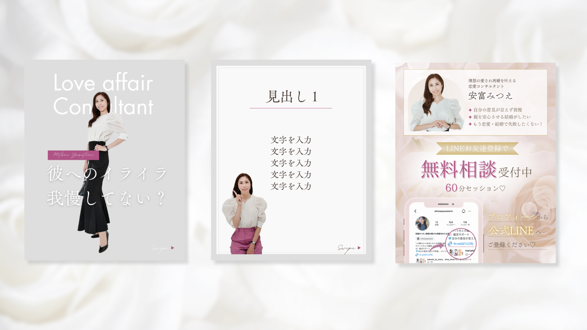 料金 | ・基本セット 内容:表紙+本文+サンクスページ 各1枚 料金:10,000円 ・世界観統一セット 内容:表紙3~4枚+本文3~4枚+サンクスページ1枚 ※表紙と本文の枚数は、ご希望の投稿の並べ方によって変わります。 料金:20,000円 ・単品オプション 内容:表紙のみ/本文のみ/サンクスページのみ 料金:表紙のみ 3,500円 本文のみ 2,500円 サンクスページのみ 4,000円 |